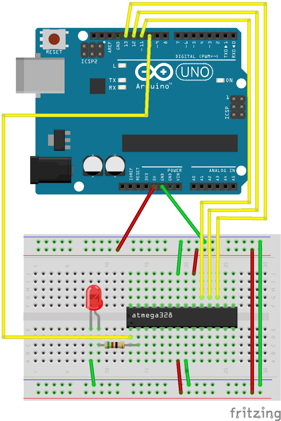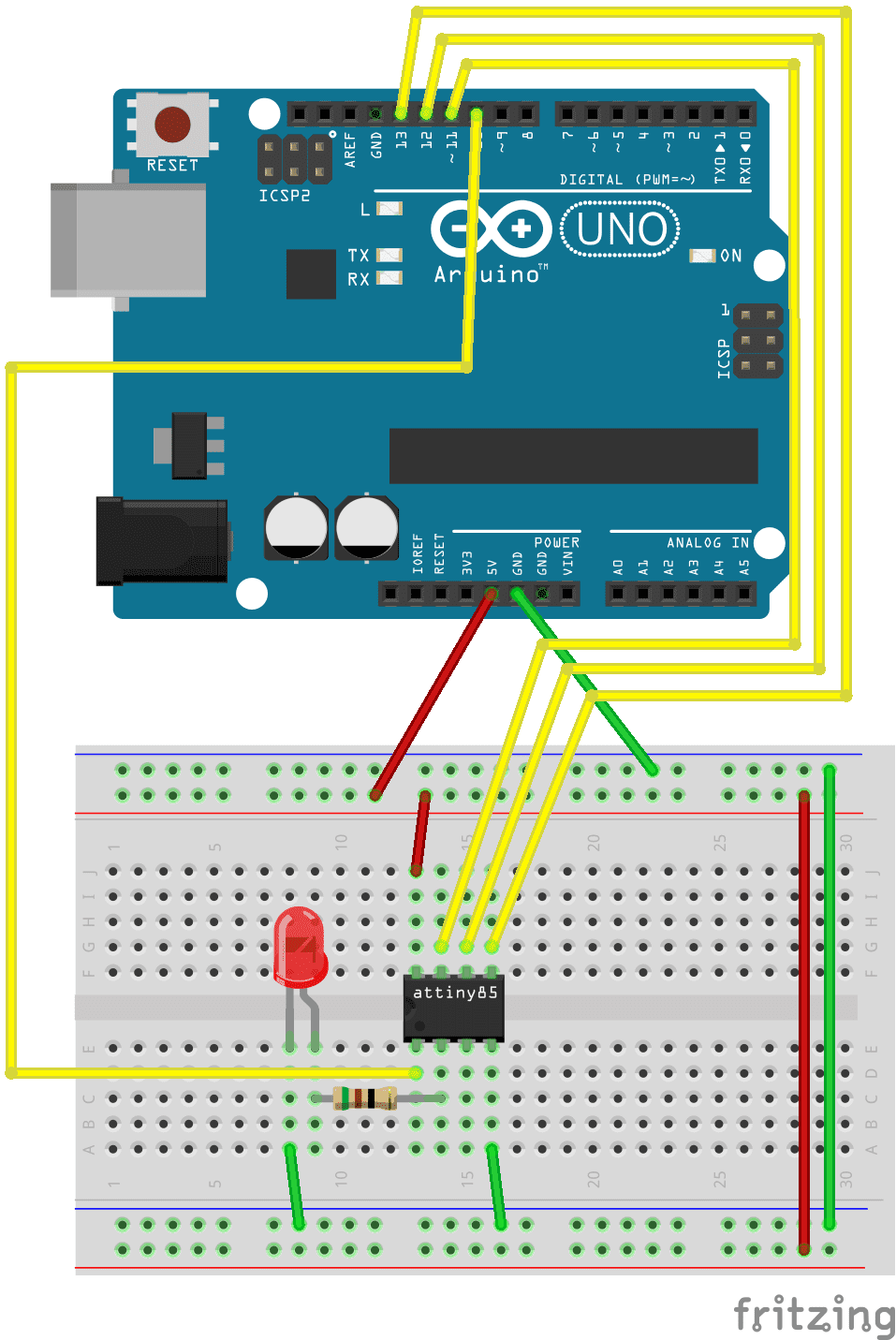 2.一度ArduinoUnoをパソコンから取り外してATmega・ATtinyを配線します。